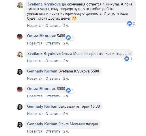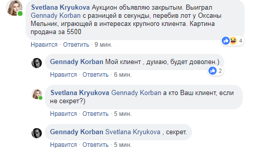 Аукцион проходил активно, за полотно боролись, в том числе, бизнесмены Александр Онищенко, Геннадий Корбан, журналист Александр Дубинский, адвокаты Андрей Богдан и Андрей Смирнов. В итоге победителем торгов стал Геннадий Корбан, который заявил, что играет в интересах крупного клиента. Его ставка - 6 тысяч долларов.