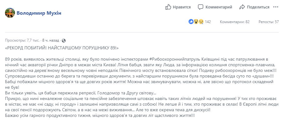 "89 лет оказалось жительнице столицы, которая была замечена инспекторами рыбоохранного патруля во время патрулирования в ночное время акватории реки Днепр в пределах города Киева. Пожилая бабушка, зовут которую Люда, по информации бывшая спортсменка-пловчиха, самостоятельно на деревянной весельной лодке неподалеку Северного моста устанавливала сети", - указывается в сообщении.