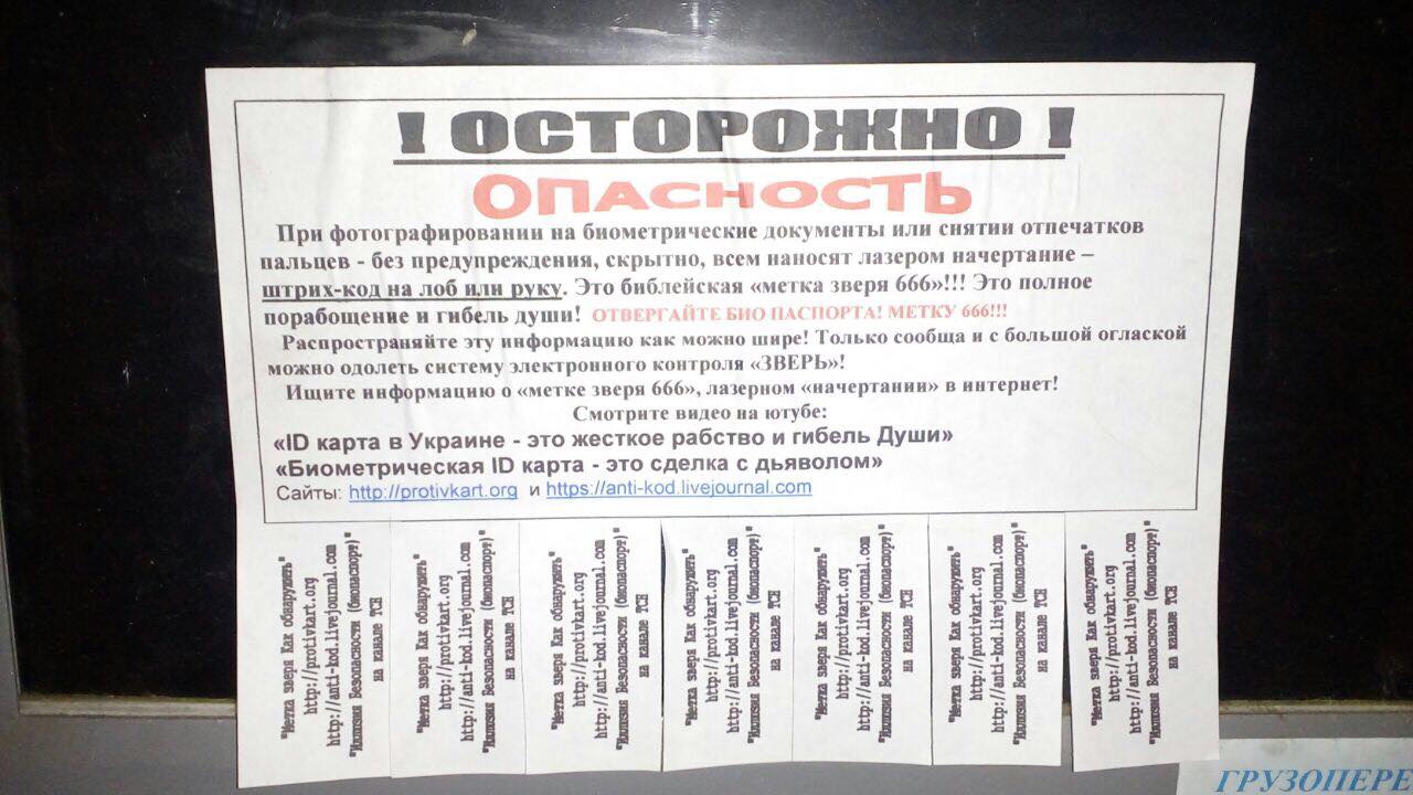 Как стало известно "Стране", подобные надписи стали появляться уже давно, при чем в разных районах столицы. К примеру, в районе станции метро "Героев Днепра" развешены объявления в которых речь идет о том, что во время фотографирования на биометрический паспорт на лоб его владельца наносится штрих-код - "метка зверя 666".
