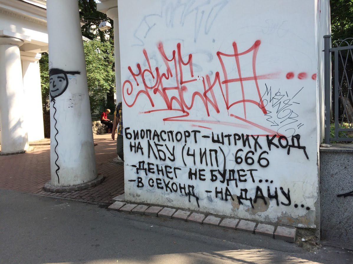 А на проспекте Победы, на Воздухофлотском мосту размещены надписи о том, что владельцам биометрии наносят на лоб метку дьявола. В районе Ботанического сада такие же надписи начертаны на асфальте тяжелым готическим шрифтом. На Шулявском мосту размещены запугивающие граффити, а летом подобные надписи появлялись в Пуще-Водице.