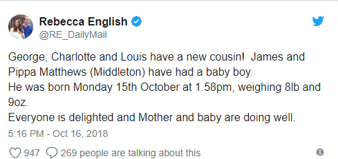 "У Джорджа, Шарлотты и Луи – новый кузен! У Джеймса и Пиппы Мэтьюз (Миддлтон) родился мальчик…. Все в восторге, а мама и ребенок чувствуют себя хорошо", – написала она в Twitter.