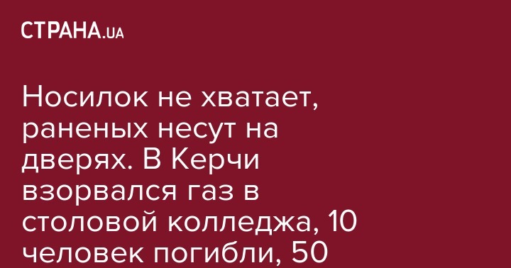 Сегодня, 17 октября, в Керчи (Крым) произошел взрыв газа в политехническом колледже. 10 человек погибли, еще 50 человек пострадали. Об этом сообщает Telegram-канал Mash.