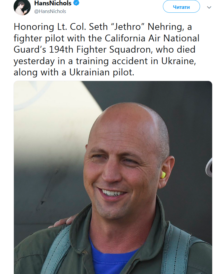 В катастрофе Су-27 под Винницей оборвалась жизнь подполковника Сэта Неринга (позывной "Джетро"). Сэт Неринг служил пилотом в 194-й боевой эскадрилье Калифорнийской воздушной национальной гвардии.