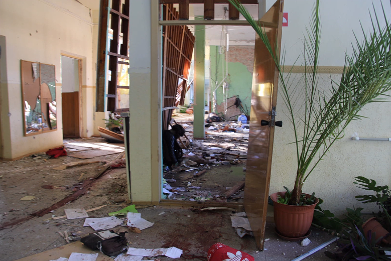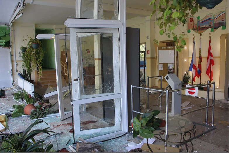 Судя по фото, на первом и втором этажах произошли наиболее крупные повреждения здания. В одном из классов уже демонтировали пластиковые окна, пришедшие в негодность после стрельбы.