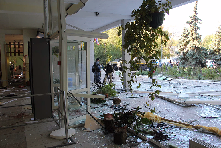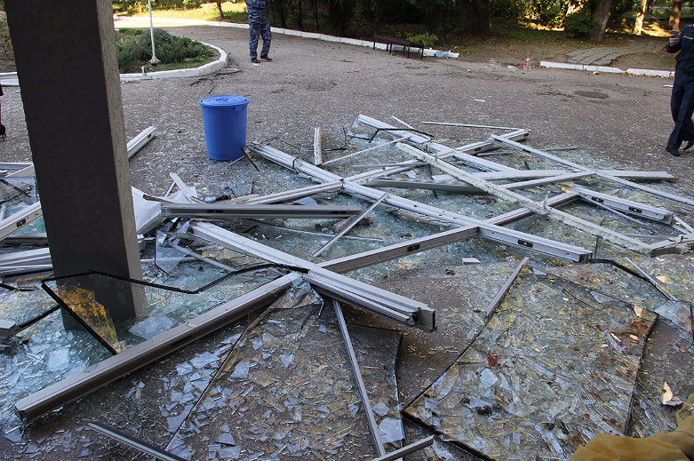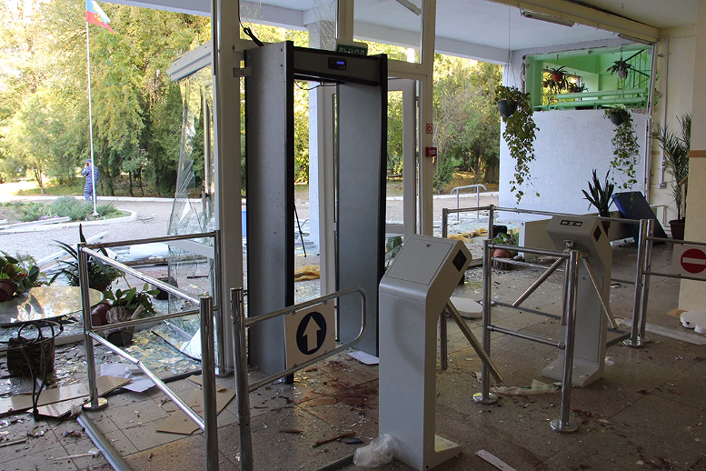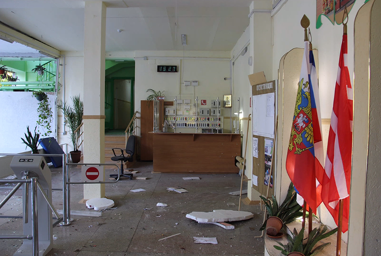 Серьезный ремонт потребуется везде: в фойе отсутствуют стекла, повалены вазоны. На полу, стенах - следы крови.