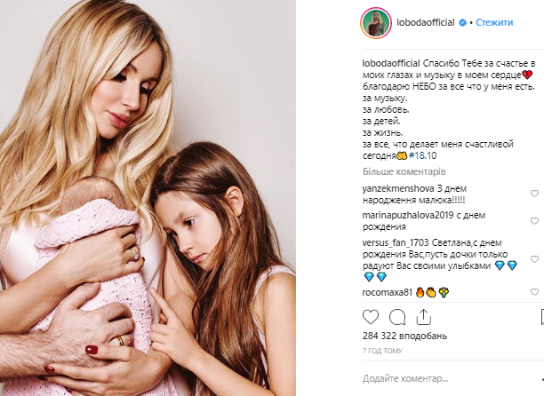Украинская певица Светлана Лобода опубликовала смейное фото на своей странице  в Instagram. На нем певица держит на руках свою младшую дочь Тильду, также к маме приживается и старшая - Ева. Также младенца придерживает еще и мужская рука, однако полностью человеке, которому принадлежит конечность не видно. Но судя по всему, это возлюбленный Лободы и отец ее младшей дочери. Фото сопровождается подписью: