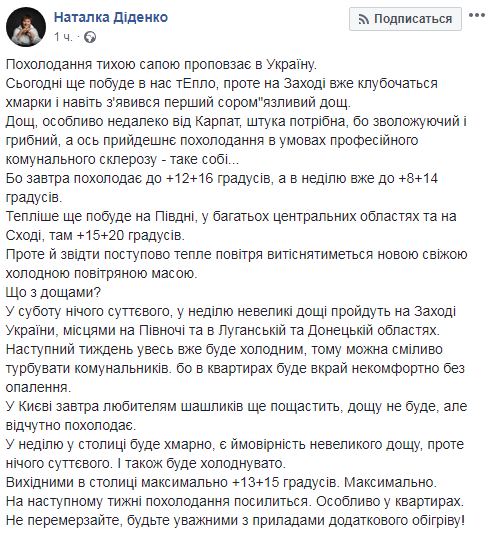 В субботу, 20 октября, похолодает до + 12... + 16 градусов, а в воскресенье уже до + 8... + 14 градусов. Об этом сообщает синоптик Наталья Диденко на своей странице в Facebook.