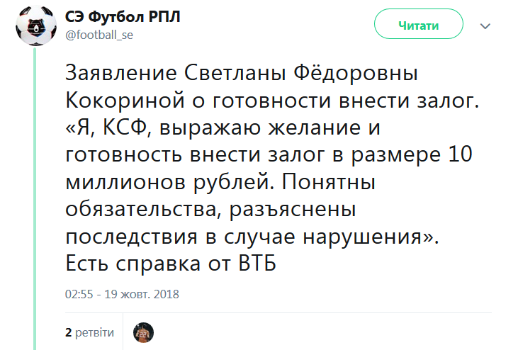 "Я, Кокорина Светлана Федоровна, выражаю желание и готовность внести залог в размере 10 миллионов рублей. Понятны обязательства, разъяснены последствия в случае нарушения. Есть справка от ВТБ", - говорится в заявлении Светланы Кокориной, озвученном в суде, 19 октября.