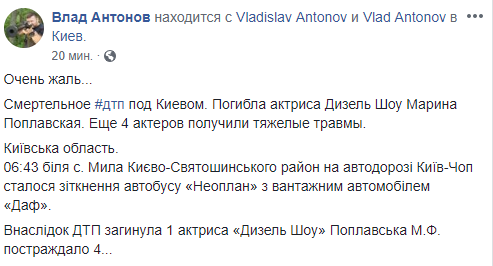 Авария произошла в Киевской области возле села Мила около 7 утра. На Житомирской трассе автобус с актерами врезался в грузовик. В результате ДТП погибла Поплавская,  еще четверо актеров коллектива "Дизель шоу" находятся в тяжелом состоянии - их госпитализировали с различными травмами.