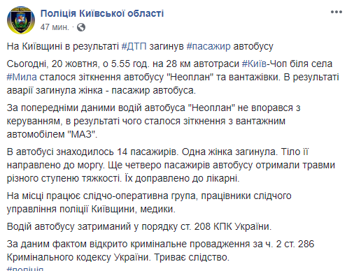 В автобусе находилось 14 пассажиров. Одна женщина погибла, четверо пассажиров автобуса получили травмы и были доставлены в больницу. Водитель автобуса задержан в порядке ст. 208 УПК Украины. По данному факту возбуждено уголовное производство по ч. 2 ст. 286 Уголовного кодекса Украины. Продолжается следствие.