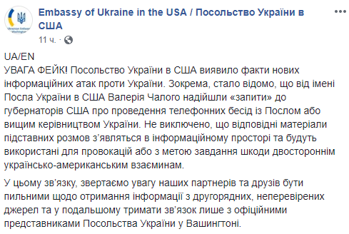 "Посольство Украины в США выявило факты новых информационных атак против Украины. В частности, стало известно, что от имени Посла Украины в США Валерия Чалого поступили "запросы" к губернаторам США о проведении телефонных бесед с Послом или высшим руководством Украины. Не исключено, что соответствующие материалы подставных разговоров появятся в информационном пространстве и использовать для провокаций или с целью нанесения вреда двусторонним украинского-американским отношениям", - сказано в сообщении.
