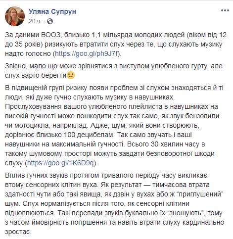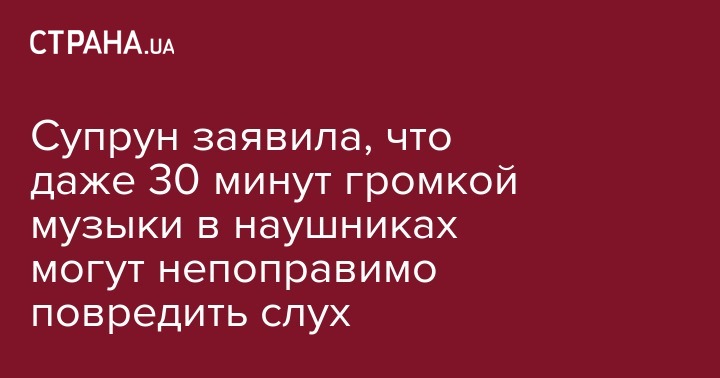 И.о. министра здравоохранения Ульяна Супрун заявила, что 30 минут прослушивания очень громкой музыки в наушниках могут нанести непоправимый вред слуху. Об этом он написала на своей странице в Facebook.