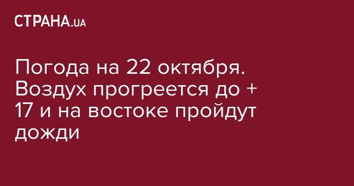В понедельник, 22 октября, в Украине ожидается преимущественно сухая и теплая погода, только на востоке страны пройдут дожди, но воздух прогреется до +17 градусов. Об этом сообщается на сайте "Укргидрометцентра".