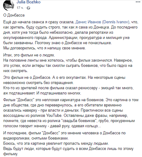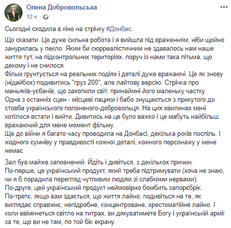 "Сегодня сходила в кино на ленту #Донбасс. Что сказать. Это очень сильная работа и я вышла под впечатлением, будто только что погрузилась в ад. Каким бы сюрреалистическим не покажется нам нашу жизнь здесь, на подконтрольных территориях, рядом с нами такая тьма, что некоторым и не снилось.
