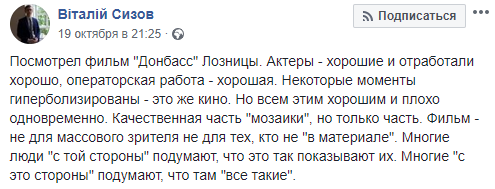 "Посмотрел фильм "Донбасс" Лозницы. Актеры - хорошие и отработали хорошо, операторская работа - хорошая. Некоторые моменты гиперболизированы - это же кино. Но всем этим хорошим и плохо одновременно. Качественная часть "мозаики", но только часть. Фильм - не для массового зрителя не для тех, кто не "в материале". Многие люди "с той стороны" подумают, что это так показывают их. Многие "с это стороны" подумают, что там "все такие".