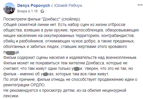 Журналист Денис Попович написал, что фильм может не понравиться жителям Донбасса, которые не считают, что там живут одни только у@и.