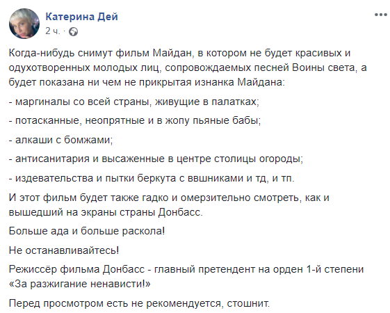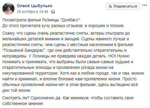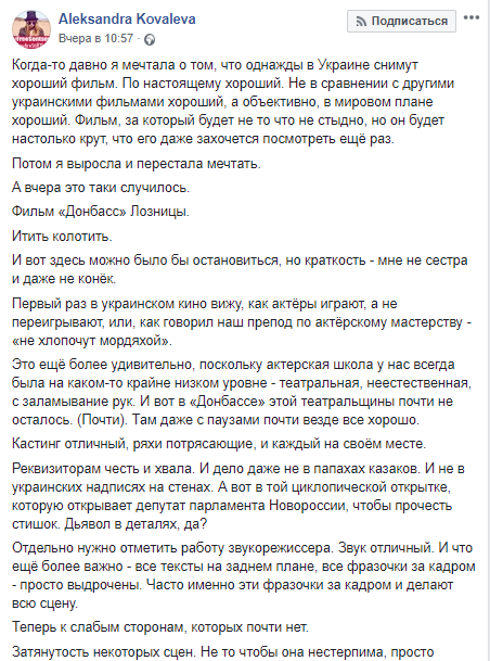 "Я вот про "Донбасс" и Лозницу молчала, потому что не знала, как этот кошмар получше описать. Я и сейчас не знаю. Но попробую. Такой грязи и тупости, как показано в фильме, на Донбассе не существует в массовых проявлениях. А именно так и показано - типа всё такое и все такие. Нет. Этого нет. Точка. Если для кого-то это правда, значит, не повезло вам. А те несколько процентов уродцев, которые портят общую картину, есть в любом регионе.