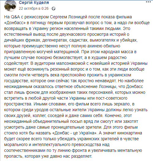 "На Q&A с режиссером Сергеем Лозницей после показа фильма "Донбасс" в пятницу первым прозвучал вопрос о том, а надо ли вообще возвращать в Украину регион населенный такими людьми. Это естественный вывод после двухчасового просмотра историй о дичайших фриках, дегенератах, садистах, вымогателях и убийцах, которые преимущественно несут полную ахинею обильно приправленную могучей матерщиной. При этом народная масса в лучшем случае покорно безмолвствует, а в худшем радостно содействует.