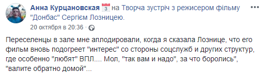 "Переселенцы в зале мне аплодировали, когда я сказала Лознице, что его фильм вновь подогреет "интерес" со стороны соцслужб и других структур, где особенно "любят" ВПЛ.... Мол, "так вам и надо", "за что боролись", "валите обратно домой"...