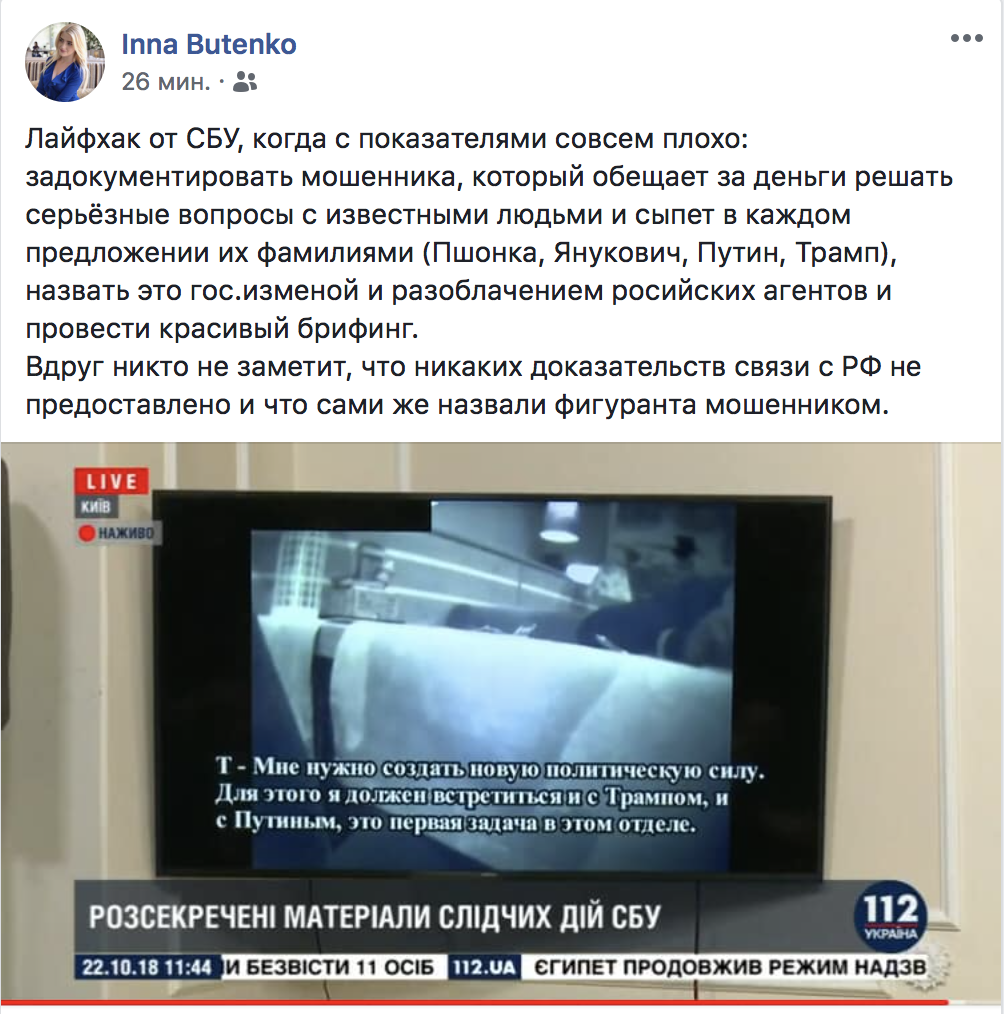 "Лайфхак от СБУ, когда с показателями совсем плохо: задокументировать мошенника, который обещает за деньги решать серьёзные вопросы с известными людьми и сыпет в каждом предложении их фамилиями (Пшонка, Янукович, Путин, Трамп), назвать это гос.изменой и разоблачением росийских агентов и провести красивый брифинг, - пишет на своей странице в ФБ адвокат Инна Бутенко. - Вдруг никто не заметит, что никаких доказательств связи с РФ не предоставлено и что сами же назвали фигуранта мошенником".