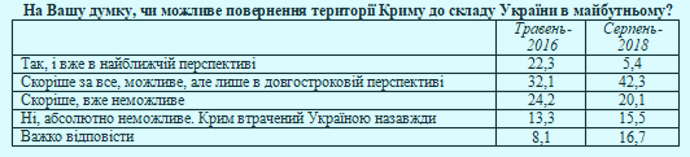 Больше всего в возвращение Крыма верят жители западного региона (65%) и центра страны (54%). Соответственно - не верят жители восточного и южного регионов Украины (по 51%). В то же время только 5% считают, что возвращение Крыма возможно в ближайшей перспективе (в мае 2016 таких оптимистов было 22%).