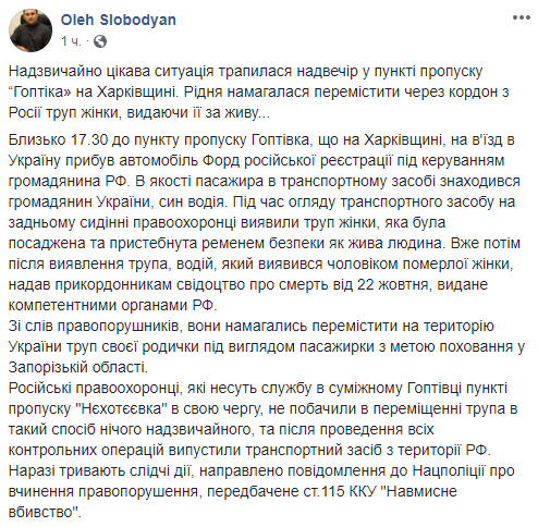Российские правоохранители, которые несут службу в смежном с Гоптовкой пункте пропуска Нехотеевка, в свою очередь, не увидели в перемещении трупа таким образом ничего удивительного, и после всех контрольных операций выпустили транспортное средство с территории России.