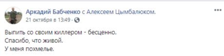 Похмельный журналист Бабченко опубликовал в Facebook фото со своим радостным киллером
