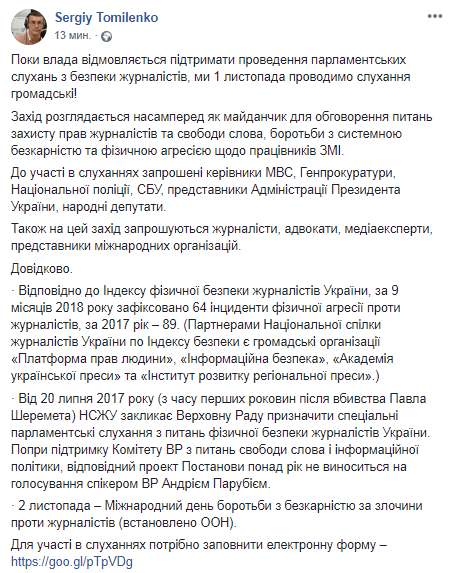 1 ноября в Киеве пройдут общественные слушания, посвященные безопасности журналистов. Об этом сообщил глава Национального союза журналистов Украины Сергей Томиленко на своей странице в Facebook.