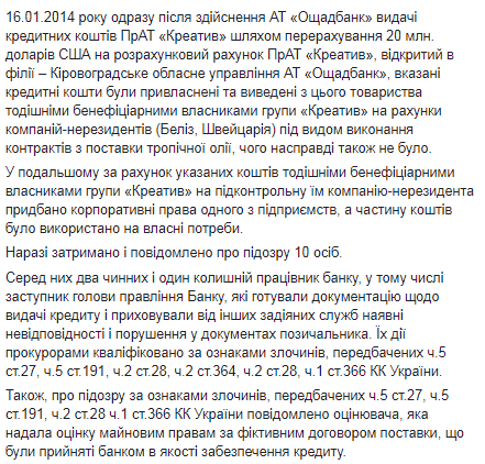 Отметим, что ранее детективы НАБУ установили, что данные лица в 2013 - 2014 годах через коррупционную кредитную схему вывели из "Ощадбанка" 20 млн долларов, что на момент совершения преступления составляло 160 млн грн. Это привело к списанию имущественных прав и, как следствие, к убыткам банка на сумму 133 млн грн из-за осуществления расходов на формирование резерва по этому кредиту.