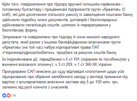 Также задержан и уведомлен о подозрении сын действующего народного депутата, который вместе с иными бенефициарными владельцами группы "Креатив" купил корпоративные права ПАО "Черноморгидрожелезобетон", приобретенные за счет средств банка. Прокуратура имени нардепа не сообщает, однако озвучивает его "Украинская правда". По данным издания, это сын народного депутата Станислава Березкина Максим.