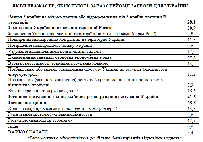 Так, 62% респондентов ответили, что для Украины существуют серьезные угрозы. Называя их, большинство опрошенных выделили экономический кризис, бедность, обесценивание гривны и захват территории страны со стороны РФ.