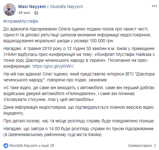 На адвоката подозреваемых по делу о нападении на народного депутата Мустафу Найма Олега Ищенко подан иск о защите чести, достоинства и деловой репутации. Об этом сообщил юрист и брат депутата Маси Найем на своей странице в Facebook.
