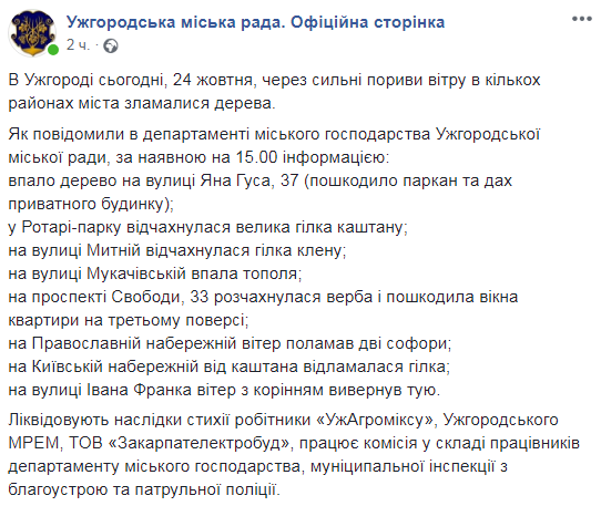 Также на улице Мукачевской упал тополь, а на проспекте Свободы, 33 развалилась ива. Она повредила окна квартиры на третьем этаже, на Православной набережной ветер поломал две софоры, на Киевской набережной от каштана отломилась ветка, а на улице Ивана Франко ветер с корнем вывернул тую.