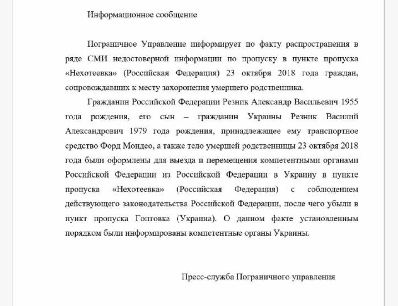 В управлении погранслужбы России сообщили, что гражданин РФ Александр Резник 1955 года рождения, его сын - гражданин Украины Василий Резник 1979 года рождения, принадлежащее ему транспортное средство Ford Mondeo, а также тело умершей родственницы 23 октября 2018 года были оформлены для выезда и перемещения компетентными органами Российской Федерации из России в Украину в пункте пропуска "Нехотеевка" с соблюдением действующего законодательства Российской Федерации.