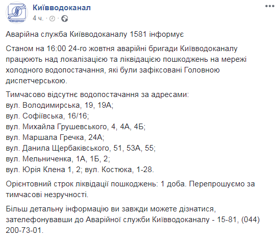 В понедельник, 24 октября, в Киеве из-за повреждений на сети холодного водоснабжения без воды остались семь улиц. Ориентировочный срок ликвидации повреждений - 1 сутки. Об этом сообщает пресс-служба КП "Киевводоканал" в Facebook.