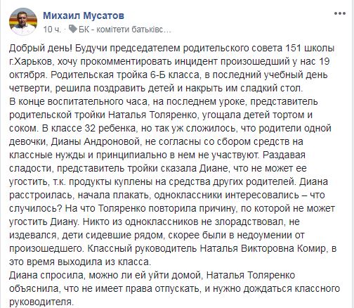 Так, председатель родительского комитета школы Михаил Мусатов на своей странице в Facebook так описывает инцидент: "Родительская тройка 6-Б класса, в последний учебный день четверти решила поздравить детей и накрыть им сладкий стол... В классе 32 ребенка, но так уж сложилось, что родители одной девочки, Дианы Андроновой, не согласны со сбором средств на классные нужды и принципиально в нем не участвуют. Раздавая сладости, представитель тройки Наталья Толяренко сказала Диане, что не может ее угостить, т.к. продукты куплены на средства других родителей. Диана расстроилась, начала плакать, одноклассники интересовались - что случилось? На что Толяренко повторила причину, по которой не может угостить Диану. Никто из одноклассников не злорадствовал, не издевался, дети сидевшие рядом, скорее были в недоумении от произошедшего. Классный руководитель Наталья Викторовна Комир, в это время выходила из класса".