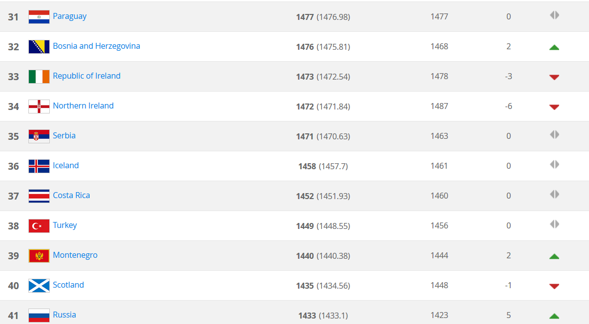 Международная федерация футбола (ФИФА) представила обновленный рейтинг национальных сборных с учетом результатов последних матчей - как официальных так и товарищеских.