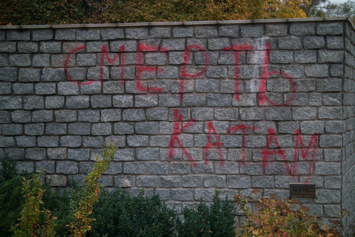 Неизвестные оставили возле памятника несколько надписей. Слева от памятника можно прочитать: "Ні червоному терору", а справа - "Смерть катам".