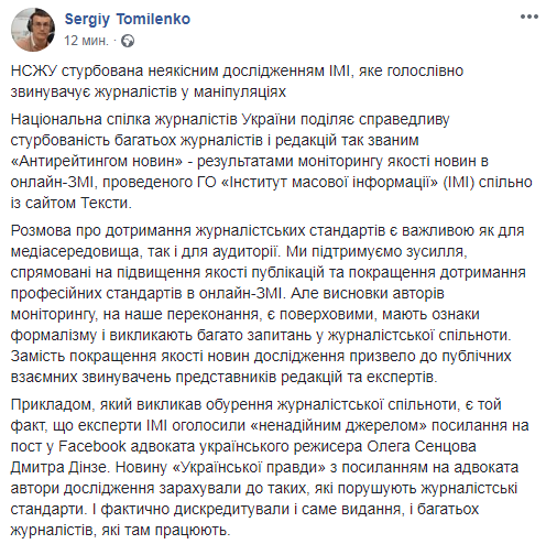 "Выводы авторов мониторинга, по нашему убеждению, являются поверхностными, имеют признаки формализма и вызывают много вопросов у журналистского сообщества. Вместо улучшения качества новостей исследование привело к публичным взаимным обвинениям представителей редакций и экспертов", - написал Томиленко.