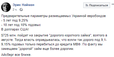 $725 млн. пойдет на закрытие "дорогого короткого займа", взятого в августе. Тогда власть оправдывалась, что взяли так дорого под 9,1-9,15% годовых только перебиться до кредита МВФ. По факту мы замещаем "дорогой" займ еще более дорогим. Айсберг все ближе", - написал в соцсети Найман.
