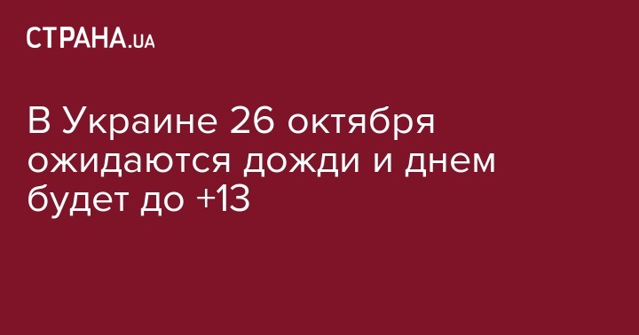 Сегодня, 26 октября, почти на всей территории страны пройдут дожди. Только в центральных, юго-западных и южных областях ожидается сухая, солнечная погода. Днем в Украине до +13 градусов, ночью от 0 градусов, но не более +6. Об этом сообщает сайт Укргидрометцентра.