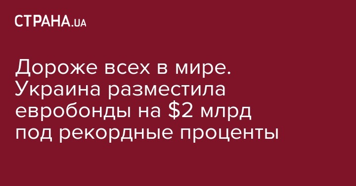 Украина разместила два выпуска еврооблигаций на общую сумму около $2 млрд, но доходность их была рекордно высокой для Украины: для 5-летних бумаг она составила 9%, 10-летних - 9,75% годовых, пишет "Интерфакс".
