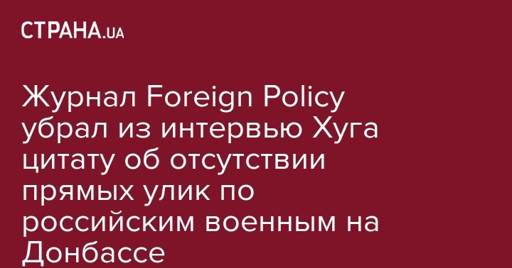 Американский журнал Foreign Policy удалил из интервью с первым замглавы специальной мониторинговой миссии Организации по безопасности и сотрудничеству в Европе (СММ ОБСЕ) Александром Хугом его утверждение об отсутствии у миссии прямых доказательств вмешательства России на Донбассе. Об этом говорится в ремарках после текста интервью на сайте издания.