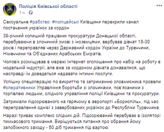 Бывший 39-летний работник прокуратуры Донецкой области, находясь в преступном сговоре с иностранцами, вербовал девушек 18-30 лет и переправлял их через границу Украины в Турцию, Германию и Объединенные Арабские Эмираты для продажи в сексуальное рабство. Об этом сообщается на странице полиции Киевской области в Facebook.