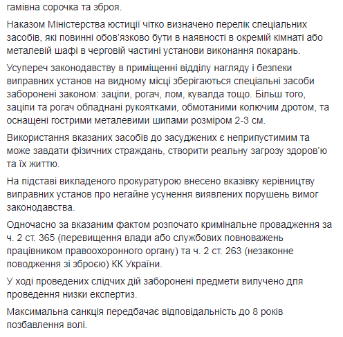 По ее информации, в результате проверки выяснилось, что в "Полтавской исправительной колонии №64", "Божковской исправительной колонии №16", "Крюковской исправительной колонии №29" и "Надержинщинской исправительной колонии №65" пытали заключенных, используя спецсредства, запрещенные законом.