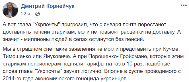 "Мы в страшном сне такие заявления не могли представить при Кучме, Тимошенко или Януковиче. А при Порошенко-Гройсмане, которые этим старикам-пенсионерам подняли тарифы на газ в 10 раз, подобные слова главы "Укрпочты" звучат логично. Вполне в русле проводимого с 2014-го года экономического геноцида украинцев", - считает политолог Дмитрий Корнейчук.
