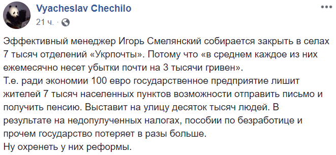"Эффективный менеджер Игорь Смелянский собирается закрыть в селах 7 тысяч отделений "Укрпочты". Потому что "в среднем каждое из них ежемесячно несет убытки почти на 3 тысячи гривен".