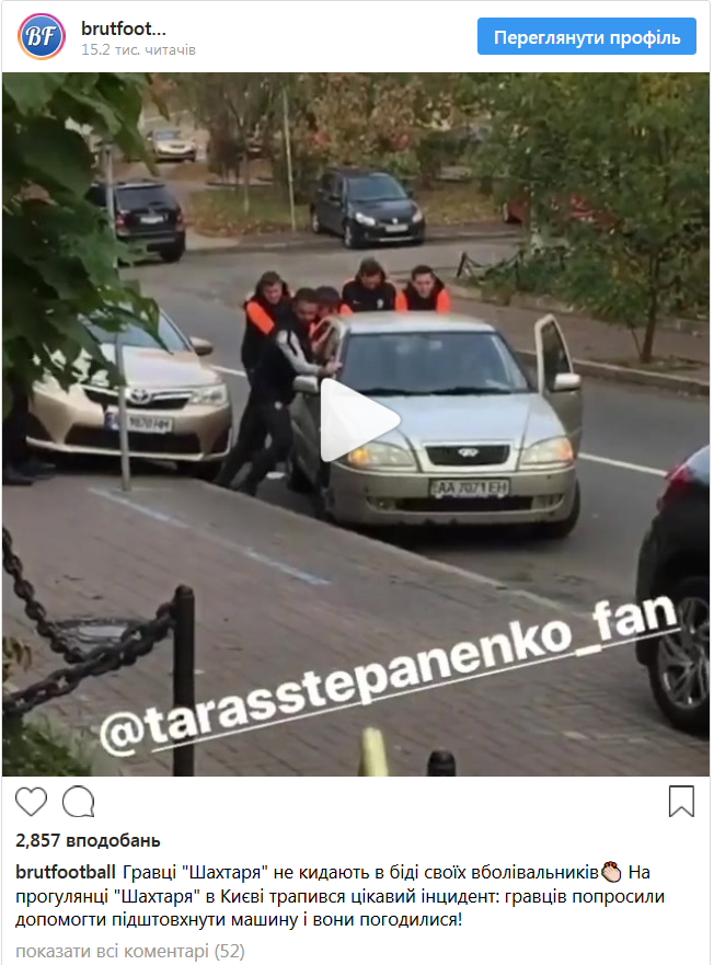 В субботу, 27 октября, киевский Арсенал в 13 туре УПЛ принимал донецкий Шахтер и был разгромлен горняками со счетом 0 - 3. Стоит отметить, что перед матчем с футболистами Шахтера произошел забавный случай. Группа игроков, во главе с Паулу Фонсекой помогла на улице автомобилисту завести заглохший автомобиль. Андрей Пятов, Тарас Степаненко и другие игроки, вместе с тренером, завели авто "с толкача".