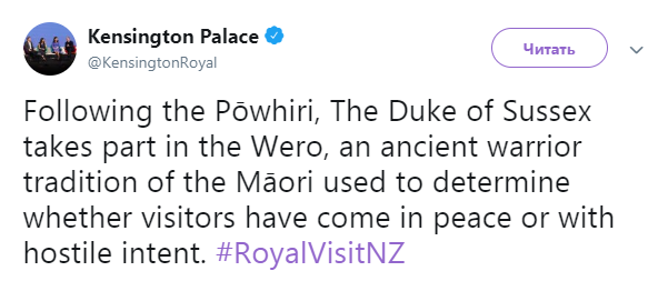 "После пофири (приветственного ритуала - Прим.Ред.) герцог Сассекский принял участие в уиро, древней традиции воинов маори, которая позволяла выяснить, пришел ли гость с миром или с враждебными намерениями", - сказано в сообщении.