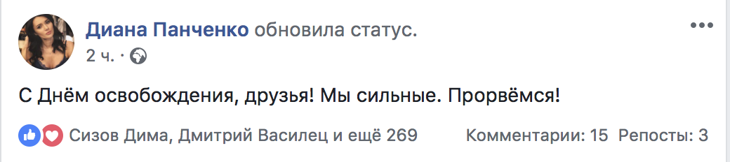А ведущая телеканала NewsOne (который власти угрожают закрыть) Диана Панченко опубликовала краткое, но вполне понятное поздравление: "с Днём освобождения, друзья! Мы сильные. Прорвёмся!".